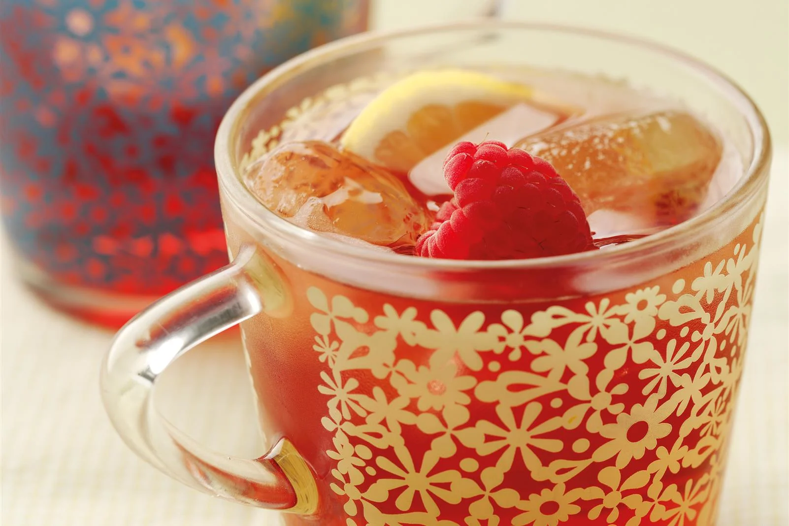Mix the tea and Cranberry and Raspberry Juice Drink together. Pour into a large glass with ice. Garnish with lemon wedge and raspberry.
